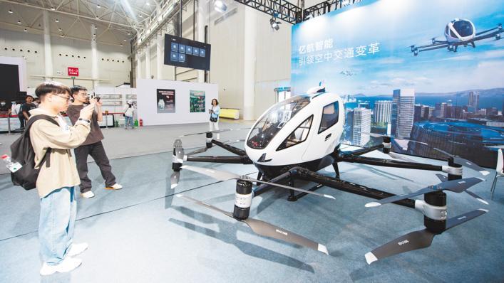 游客在智能自動駕駛飛行器展品前駐足觀看。