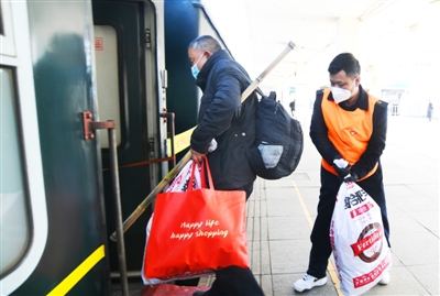 29日,咸寧火車站,鐵路青年志愿者幫行李較多的老年旅客提行李上車。咸寧日報全媒體記者陳紅菊攝。