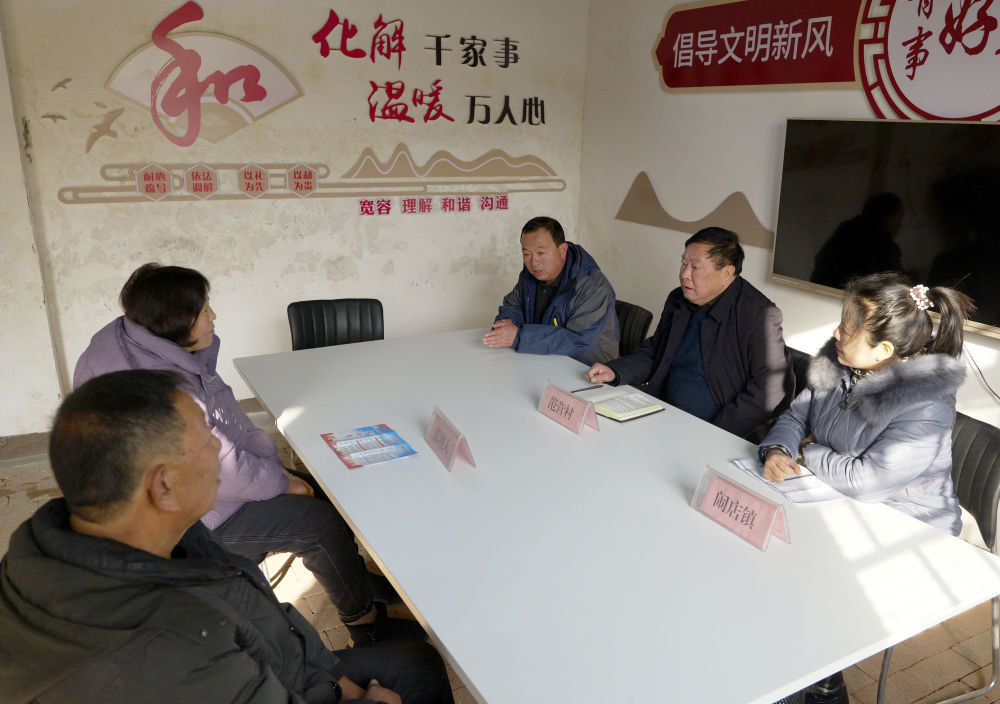 在河南省寶豐縣鬧店鎮(zhèn)范營村“擺理堂”,村鎮(zhèn)干部(右)為村民進(jìn)行信訪調(diào)解(2023年12月20日攝)。河南省寶豐縣積極推進(jìn)四下基層工作深入開展,已打造鬧店鎮(zhèn)范營村“擺理堂”、石橋鎮(zhèn)東大莊村“老娘舅茶室”等系列鄉(xiāng)村社區(qū)服務(wù)陣地,協(xié)調(diào)鄰里關(guān)系,有效化解各類矛盾,同時(shí)不斷豐富工作內(nèi)容,拓展服務(wù)功能,助力鄉(xiāng)村振興。新華社記者 李嘉南 攝