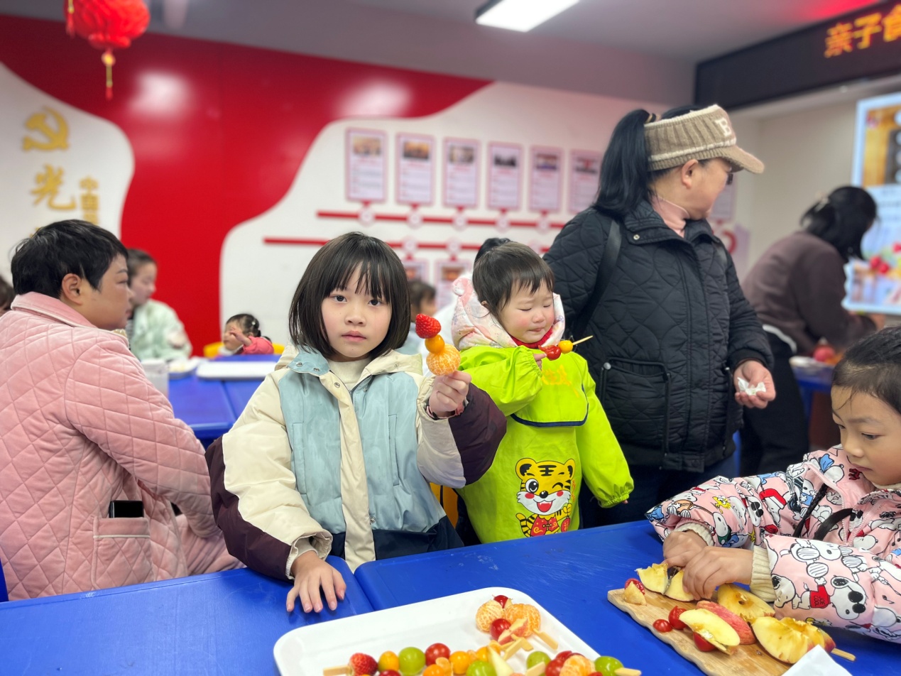 喜迎龍年巧手做花炮活動中,志愿者老師們為小朋友講解春節的由來、節日的風俗,教孩子們用彩紙制作手工花炮。小朋友用稚嫩的筆畫,認認真真在大紅色的外殼上寫下“龍年大吉”,小小一枚紙花炮,帶來濃濃年味。再來點傳統小吃,為節日氛圍“加碼”。小朋友們洗凈水果、擦干水分,挑選自己喜歡的水果在家長的幫助下穿進竹簽,做成一個個半成品的冰糖葫蘆。志愿者們熬煮糖漿,挨個兒把小朋友送來的“糖葫蘆胚”澆上糖稀,一串串晶瑩剔透的冰糖葫蘆就完成了。吃上自己制作的糖葫蘆,小朋友們比著誰咬出的聲音更清脆。
