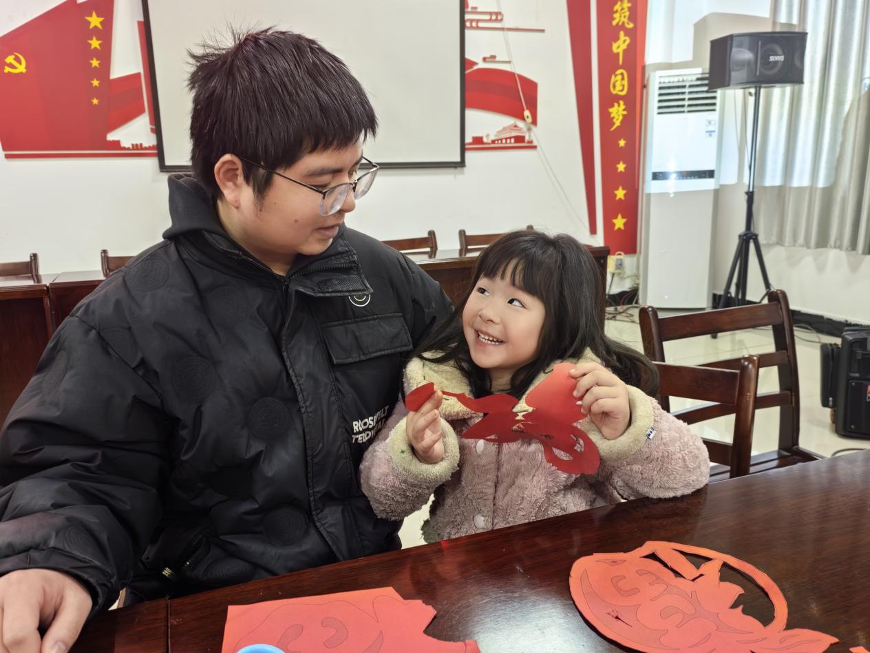 “看,這是我剪出來的福字,我要帶回家貼在我房間的窗戶上!”第一次剪紙的陳書瑤臉上洋溢著笑容,開心地舉著手中的作品向身邊的爸爸說道。