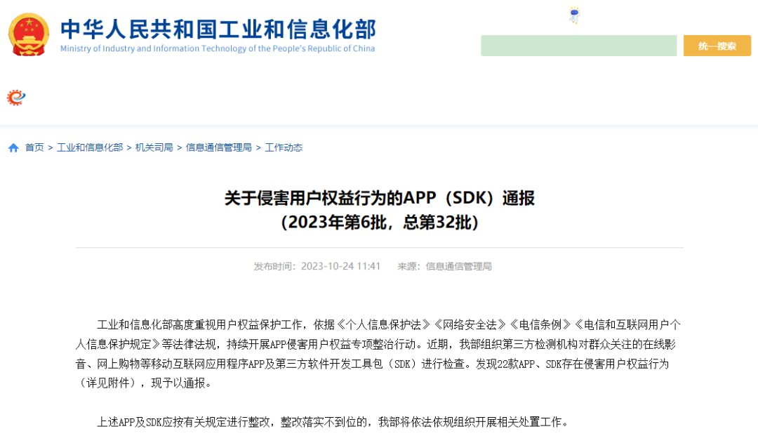 工業和信息化部通報存在問題的APP(SDK)名單