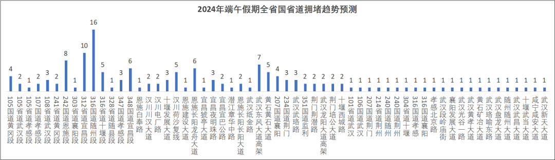 316國道隨州、十堰段,312省道宜昌段,242國道恩施段、348國道宜昌段,105國道黃岡段,207國道襄陽段以及武漢東風(fēng)大道高架、恩施長陽龍舟大道、漢川荷沙復(fù)線、黃石黃石大道等路段擁堵程度較高。
