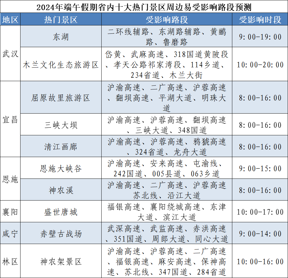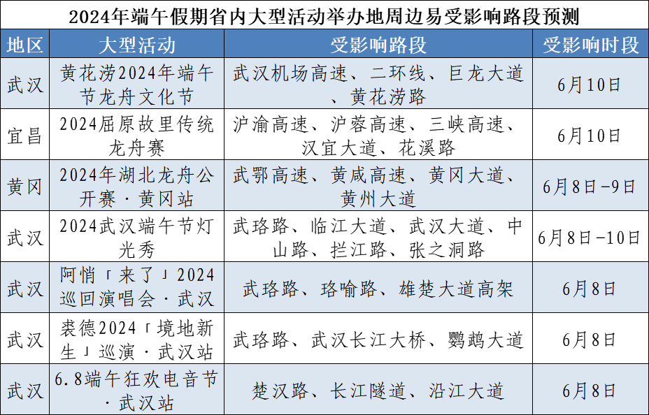 湖北交警預(yù)測:今年端午假期,擁堵時段主要集中在6月7日16~21時、6月8日9~12時、6月10日14~20時,其中第一日擁堵程度最高。假期,省內(nèi)景區(qū)將備受游客青睞,城市商圈、廣場、公園等地群眾休閑逛街增多,因人流車流集中,部分路段易受影響。初步統(tǒng)計,端午假期省內(nèi)將有龍舟賽、音樂節(jié)、燈光秀等7場大型活動,期間活動周邊道路因人流車流集中易發(fā)生交通緩行。