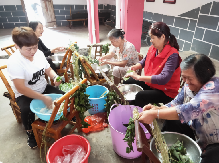 6月5日,窯咀村蘇家灣的爺爺奶奶們一大早就聚集在文化禮堂門(mén)前的廣場(chǎng)上,工作人員已經(jīng)準(zhǔn)備好了包粽子所需的材料。大家一到場(chǎng),便開(kāi)始了今天的工作,爺爺奶奶們手法嫻熟,一邊包粽子,一邊聊天,手指翻飛,絲毫不耽誤。大家嘮著家長(zhǎng)里短,說(shuō)著這幾年蘇家灣的巨大變化,時(shí)間在歡聲笑語(yǔ)中悄然而過(guò)。