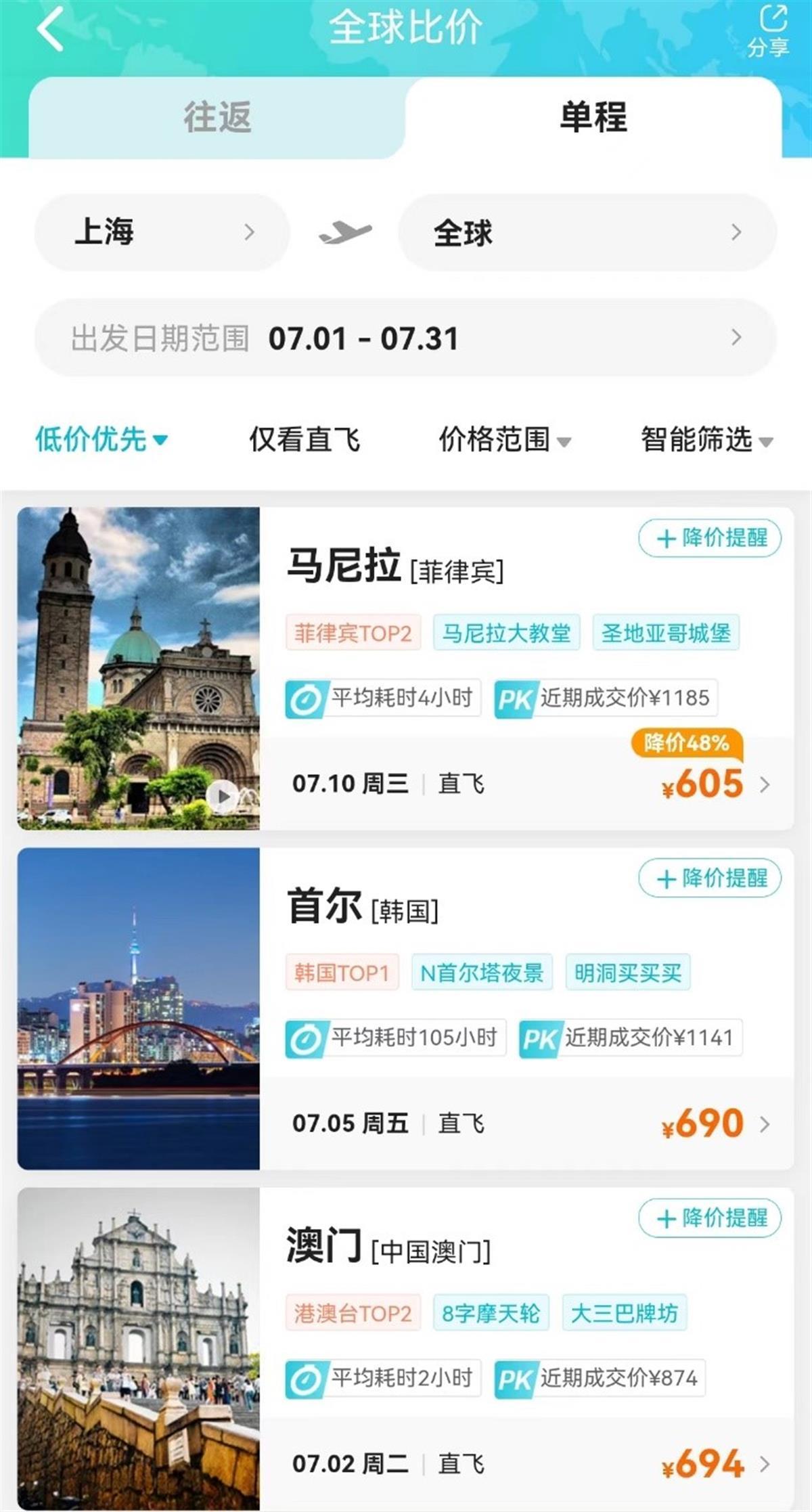 隨著國際航班恢復,今年暑期將迎來出境游熱潮,部分旅客已提前籌備簽證,并預訂機票。在去哪兒平臺上,7月初上海飛往菲律賓馬尼拉、韓國首爾、馬來西亞吉隆坡、泰國曼谷的機票價格均在千元以內。