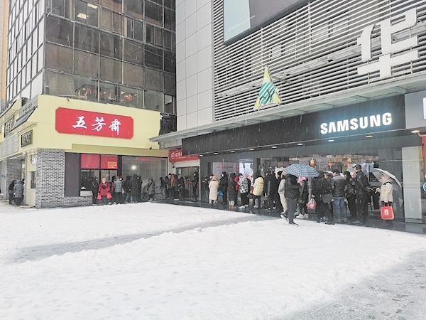 雨雪天氣將武漢一夜之間刷白,但絲毫阻擋不了“好吃佬”們的步伐。2月22日一大早,天上的冰粒還在“噼里啪啦”地下著,老字號五芳齋門前就已排起長龍。