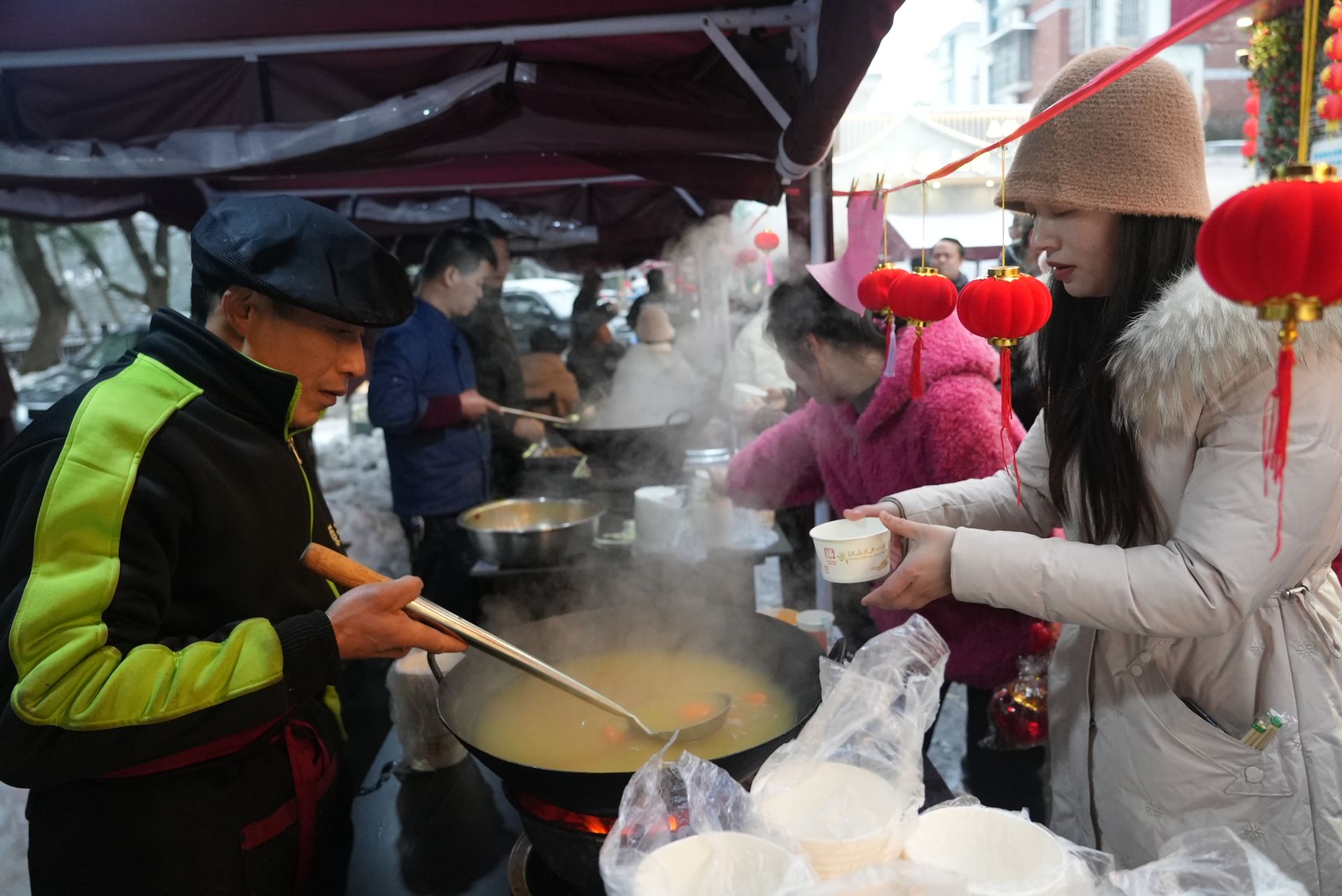 在舞臺的不遠處,湯圓、八寶飯、小酥肉、水煮丸子等應景傳統(tǒng)美食一字排開,“免費試吃”的招牌底下吸引了不少市民前來圍觀。一碗碗熱氣騰騰的湯圓端到大家手中時,升騰的煙火氣,是團團圓圓的幸福時光。