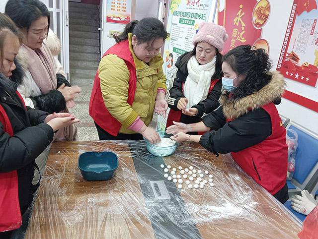 社區工作人員早早地就來到社區,拿出準備好的糯米粉、花生餡、芝麻餡等材料,搓、捏、按、團,不一會兒,一個個圓滾滾、寓意著團圓的元宵便做好了。