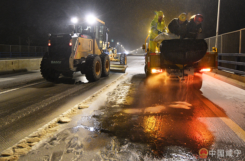 2月21日晚,我市交通運輸部門組織平地機和撒鹽車,對大洲湖大橋進行鏟雪除冰和撒鹽化雪,保障安全暢通。