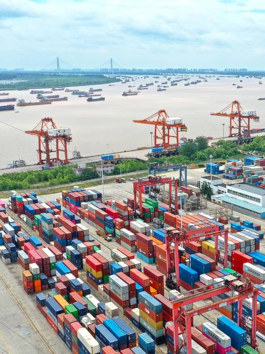 繁忙的武漢陽邏港國際集裝箱碼頭。目前,陽邏港已開辟多式聯(lián)運通道42條,輻射區(qū)域延伸到西北、西南內(nèi)陸地區(qū)及歐洲腹地,實現(xiàn)“通江達海”。(湖北日報全媒記者 李溪 攝)
