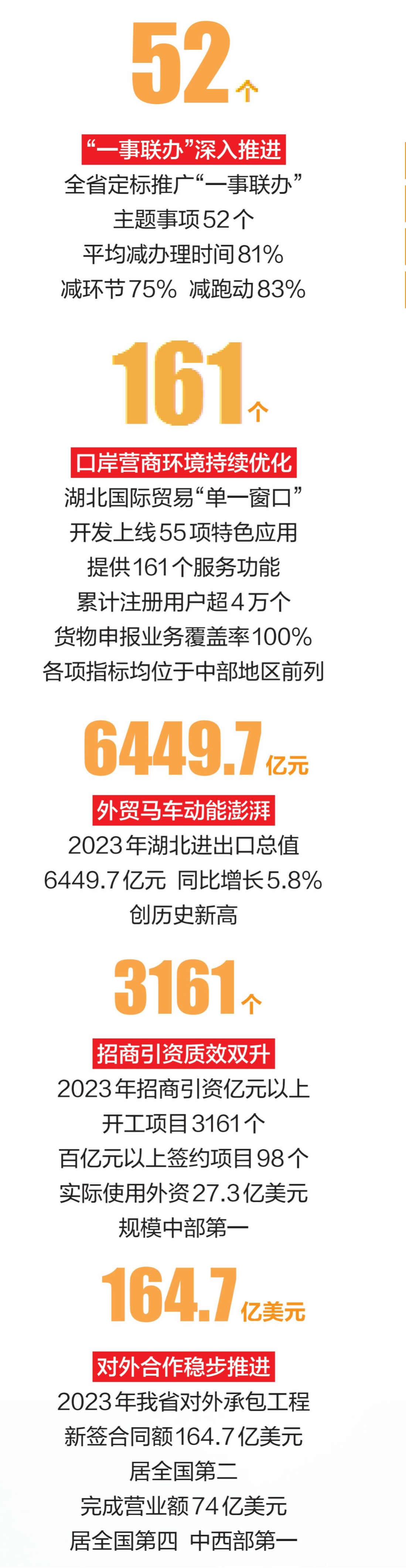 湖北日報訊?。ㄓ浾呃畛迹I商環(huán)境首次跨入全國第一方陣,全省進出口總值創(chuàng)歷史新高、實際使用外資規(guī)模中部第一……2023年,湖北堅持“用好改革開放關(guān)鍵一招”,經(jīng)濟發(fā)展內(nèi)生動力不斷,改革開放紅利持續(xù)釋放。