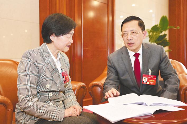 3月5日中午,住鄂全國政協(xié)委員信思金(右)與徐禮華認(rèn)真討論提案。 (湖北日報(bào)全媒記者 陳少哲 攝)