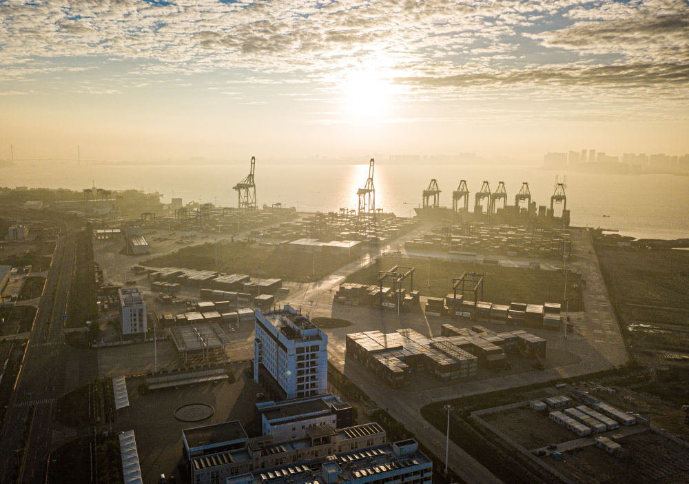2024年1月1日在海南省洋浦經濟開發區拍攝的海南自貿港集裝箱航運樞紐——洋浦國際集裝箱碼頭(無人機照片)。新華社記者 蒲曉旭 攝