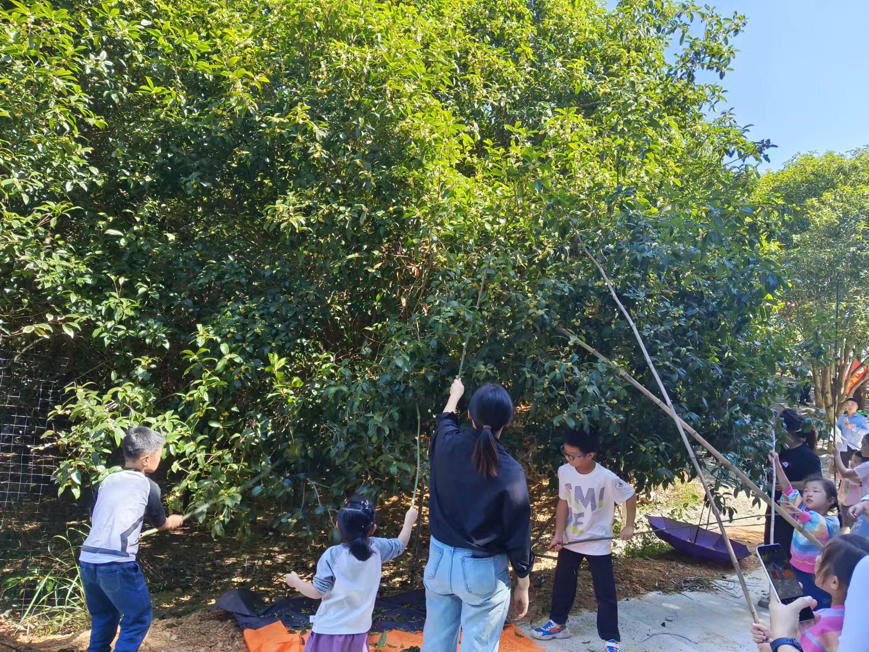 10月2日,在咸安區桂花鎮明星村桂花雞養殖專業合作社,游客和孩子們一起打桂花、撿雞蛋、畫蛋殼畫、喝柴火灶土雞湯,度過愜意的親子時光。