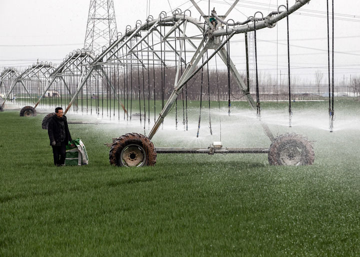 2024年3月18日,在河南省焦作市博愛縣孝敬鎮(zhèn)東原莊村瑞輝家庭農(nóng)場,村民使用全自動指針式噴灌機(jī)進(jìn)行澆灌作業(yè)。新華社發(fā)(程全攝)
