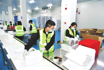 6月13日,七彩牧場供應鏈有限公司打包車間內(nèi),工作人員正加緊打包來自全國各地的訂單。