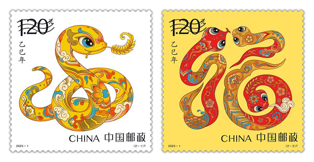 乙巳年特種郵票圖稿,左為“蛇呈豐稔”,右為“福納百祥”。(中國郵政集團(tuán)有限公司供圖)