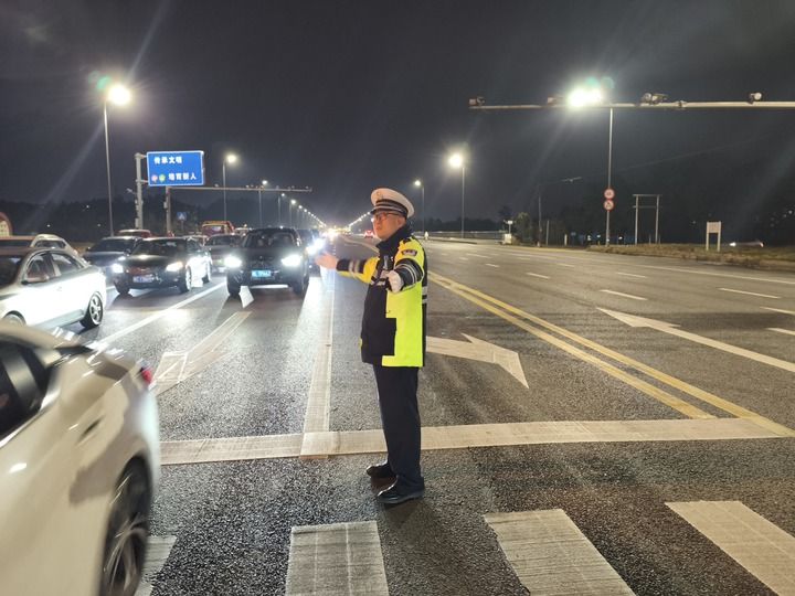 ?1月25日晚,張潔在樂山市蘇稽新區西岸路口指揮疏導交通。新華社發(劉冉攝)