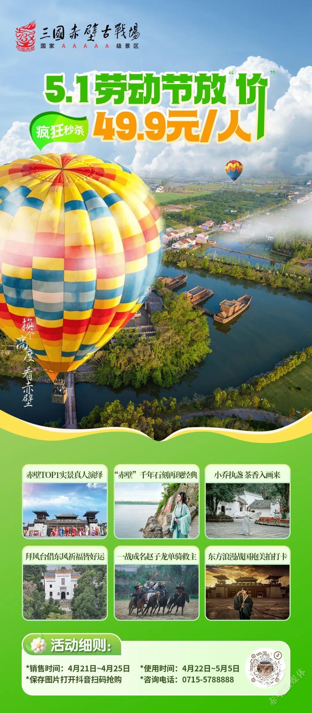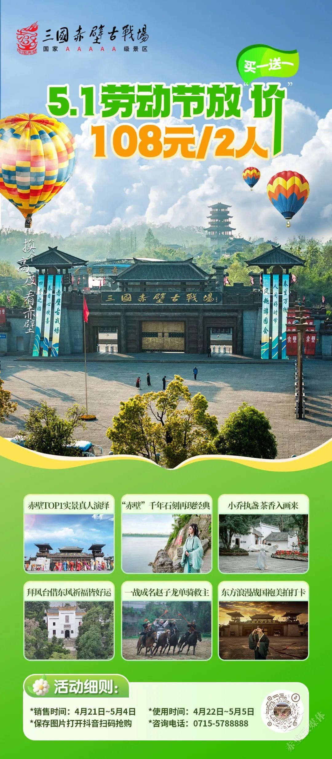 換個視角看三國,告別地面視角,搭乘熱氣球直上云霄!將赤壁古戰場的雄渾氣勢盡收眼底,感受歷史的厚重與自然的壯美在腳下交織。(注:兒童票為1.4m以下,每天數量有限,先到先得,售完即止。)