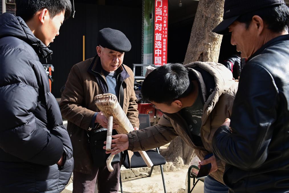 2月13日,李學員(左二)在焦岱大集上向顧客介紹自制的手工凳子。新華社記者鄒競一 攝