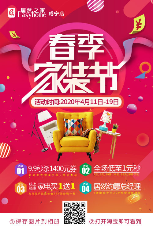 咸寧網訊:疫寒散去,春天已至。經歷了近兩個月的宅家時光,不少人發現自己對家的舒適性要求越來越高,對家的煥新欲望也越發強烈。春季煥新家正當時,4月11日-4月19日,居然之家咸寧店在確保防控安全的前提下,降低廣大市民外出風險的同時,為廣大顧客朋友們獻上“淘寶春季家裝節”線上搶購活動。