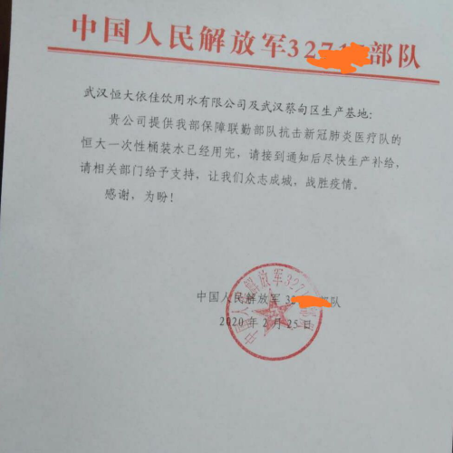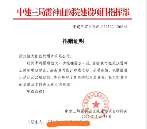 今年元月中旬,新型冠狀肺炎疫情暴發后,武漢恒大依佳飲用水有限公司(以下簡稱:武漢·恒大)的董事長蔣乙祿在危難之際,擔當社會責任,不畏疫情,克服困難,快速將一批恒大16.8L一次性桶裝水送到武漢雷神山醫院施工現場,為打贏這場沒有硝煙的疫情防控阻擊戰貢獻力量。
