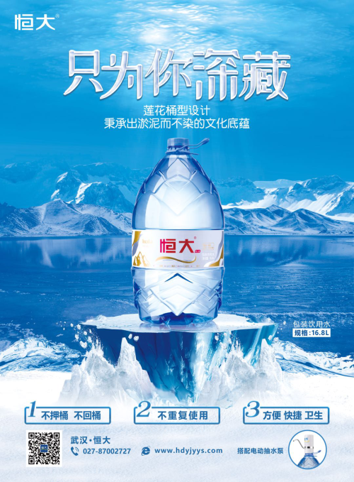 武漢·恒大生產的16.8L一次性桶裝水具有不押桶、不回桶、單次消毒、只使用一次避免造成桶裝水二次污染、獨家使用、保質期一年的優點,深受廣大消費者的喜愛。一次性桶裝水將是未來飲用水行業發展的趨勢,是消費者家庭、辦公用水的最新選擇。