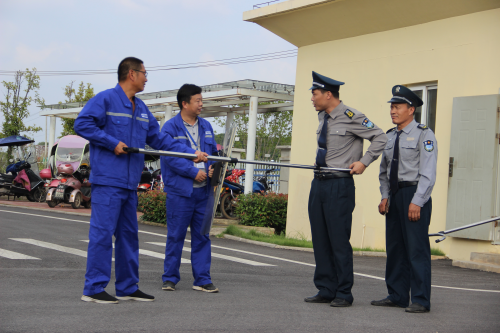 “放下武器,不準動”。反恐防暴演練在緊張激烈的斗爭中開啟。演練現場在王英水廠正門,一名可疑人員持兇器強行進入水廠,盡管保安人員一再言語阻止,但可疑人員依舊我行我素,采取翻越柵欄方式進入水廠。保安人員第一時間拿起盾牌、警棍、鋼叉等警用防暴工具,迅速將可疑人員制服,順利完成此次反恐防暴演練。