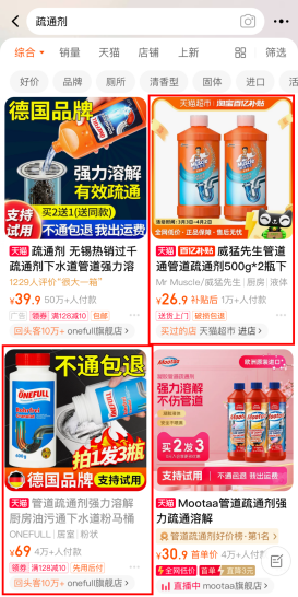 經過調查發現,無論是線下商超還是線上購物平臺,常見品牌的管道疏通劑價格均為幾十元,相比之下,維修人員口中300多元/千克的疏通劑更是“天價”。
