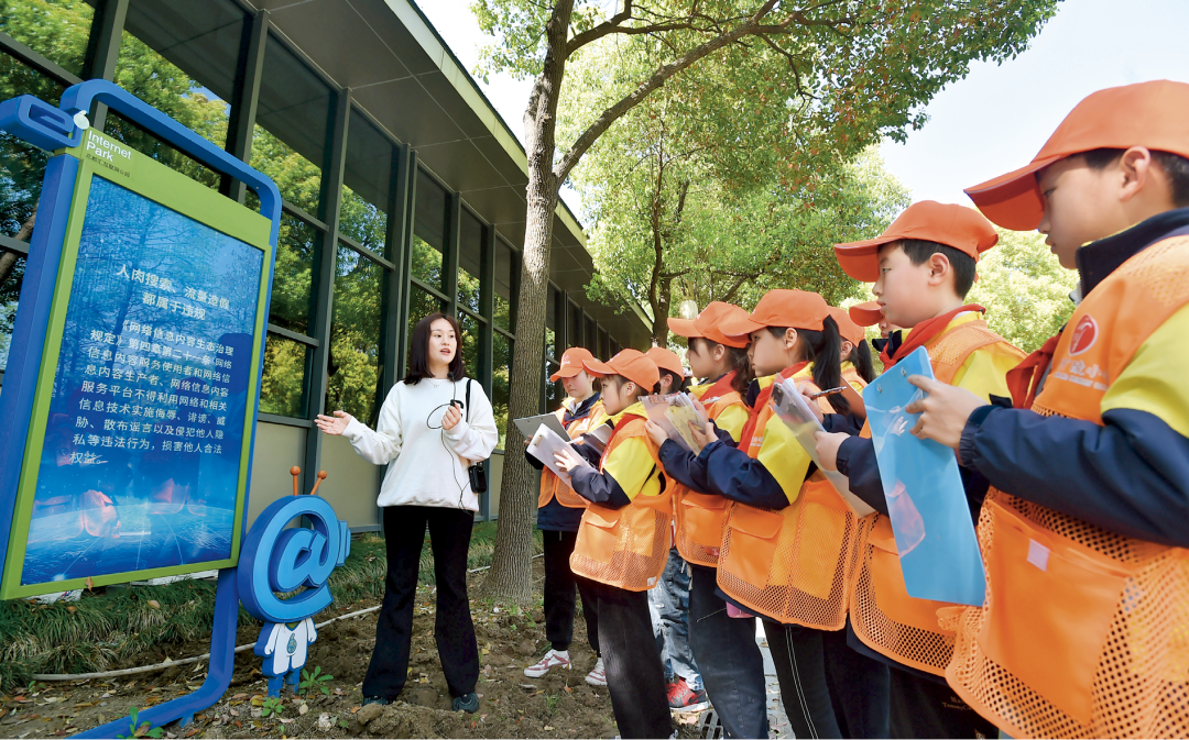 ▲2024年4月10日,江蘇省揚州市廣陵小學的學生在花都匯互聯網公園內學習網絡法治相關知識。