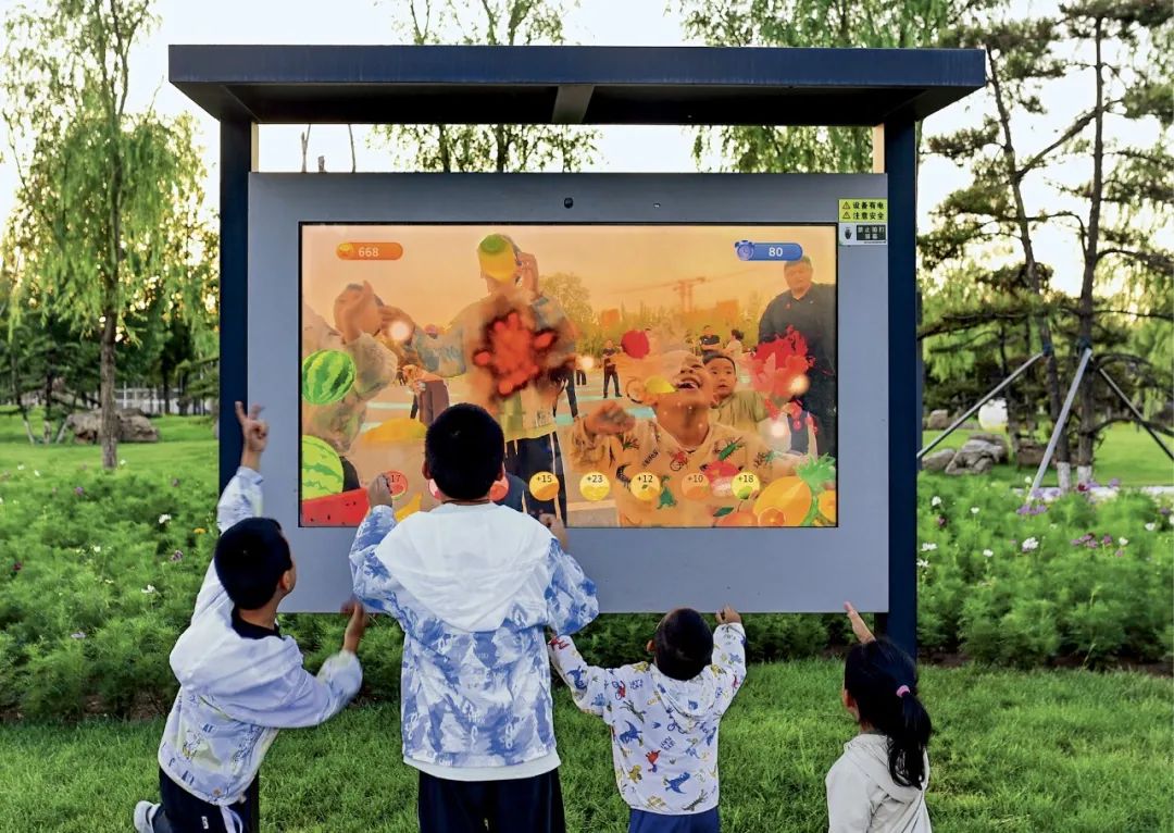 2024年8月,內蒙古自治區鄂爾多斯市的小朋友在康巴什區智慧體育公園里的AR(增強現實)互動大屏前游戲。為全球人工智能治理貢獻中國智慧