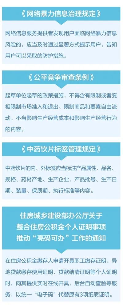 編者按:規(guī)范對(duì)網(wǎng)絡(luò)暴力信息和賬號(hào)的處置,強(qiáng)化用戶權(quán)益保護(hù);明確公平競爭審查標(biāo)準(zhǔn),著力打破地區(qū)封鎖和行業(yè)壟斷;全面實(shí)行住房公積金個(gè)人證明事項(xiàng)“亮碼可辦”;在我國境內(nèi)生產(chǎn)、經(jīng)營的中藥飲片,應(yīng)標(biāo)注產(chǎn)品規(guī)格、藥材產(chǎn)地、生產(chǎn)企業(yè)等信息……8月1日起,《網(wǎng)絡(luò)暴力信息治理規(guī)定》《公平競爭審查條例》《中藥飲片標(biāo)簽管理規(guī)定》等一批法律法規(guī)施行,聚焦群眾關(guān)切,以法治力量推動(dòng)經(jīng)濟(jì)社會(huì)高質(zhì)量發(fā)展。