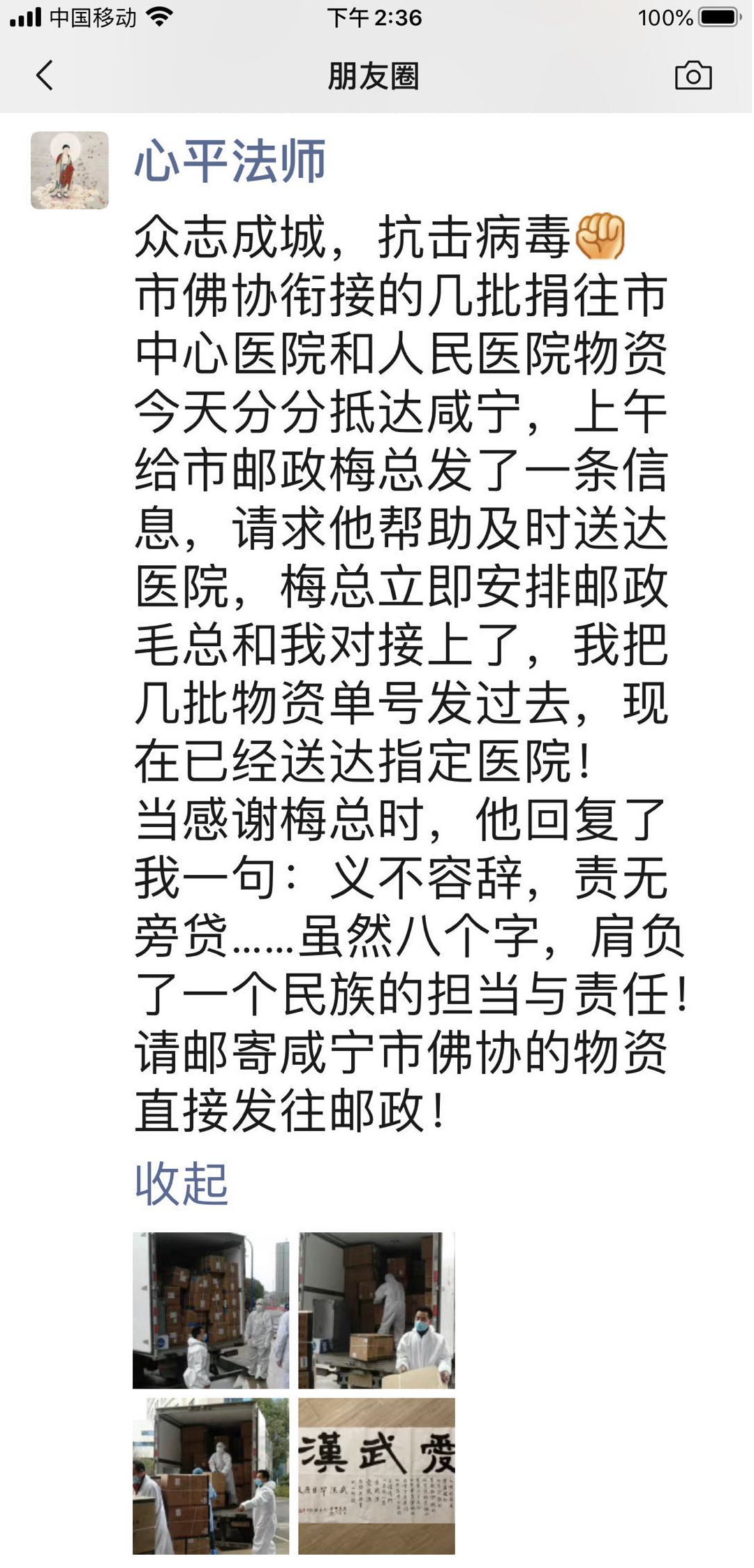 “義不容辭,責(zé)無(wú)旁貸……雖然八個(gè)字,肩負(fù)了一個(gè)民族的擔(dān)當(dāng)與責(zé)任!請(qǐng)郵寄咸寧市佛協(xié)的物資直接發(fā)往郵政!”14點(diǎn)36分,心平法師在自己的朋友圈里發(fā)布了這條感慨的信息。