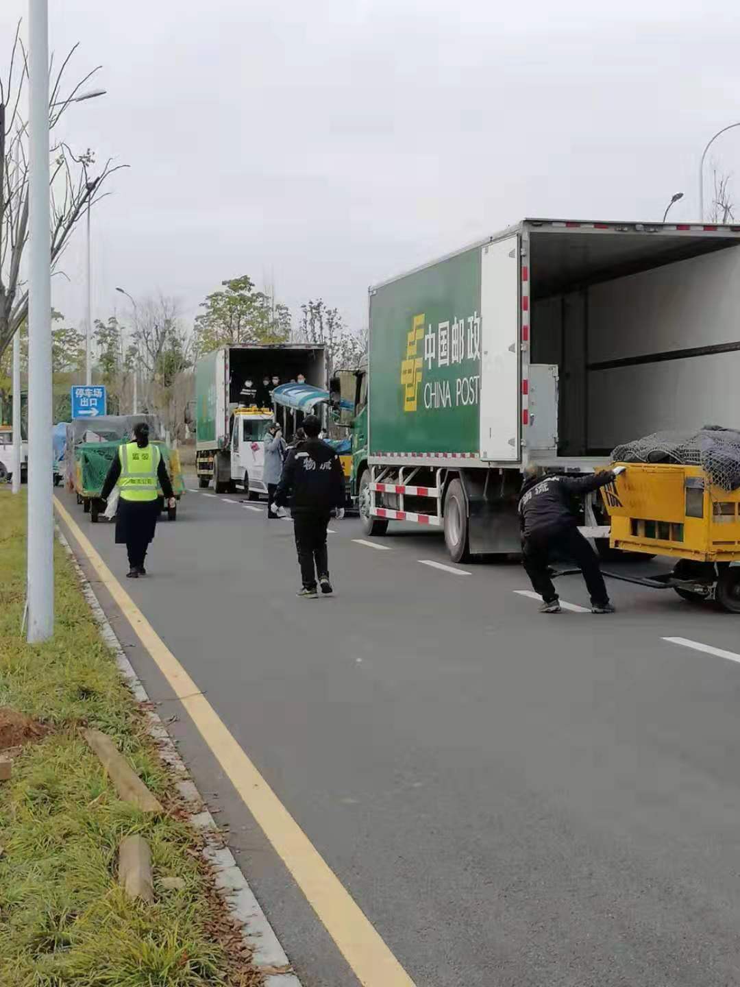 10:30,5輛郵車在陣陣掌聲中有序駛出網路運營中心。12:00,午時陽光正好,5輛8噸郵車組成的運輸隊在市指揮部交通組的帶領下,一路綠燈駛向疫情重災區中的武漢天河機場。13點45分,郵車整齊劃一地停靠在機場物流中心,他們靜靜地仰望著湛藍的天空,虔誠地等待著云南“白衣天使”們的“下凡”。